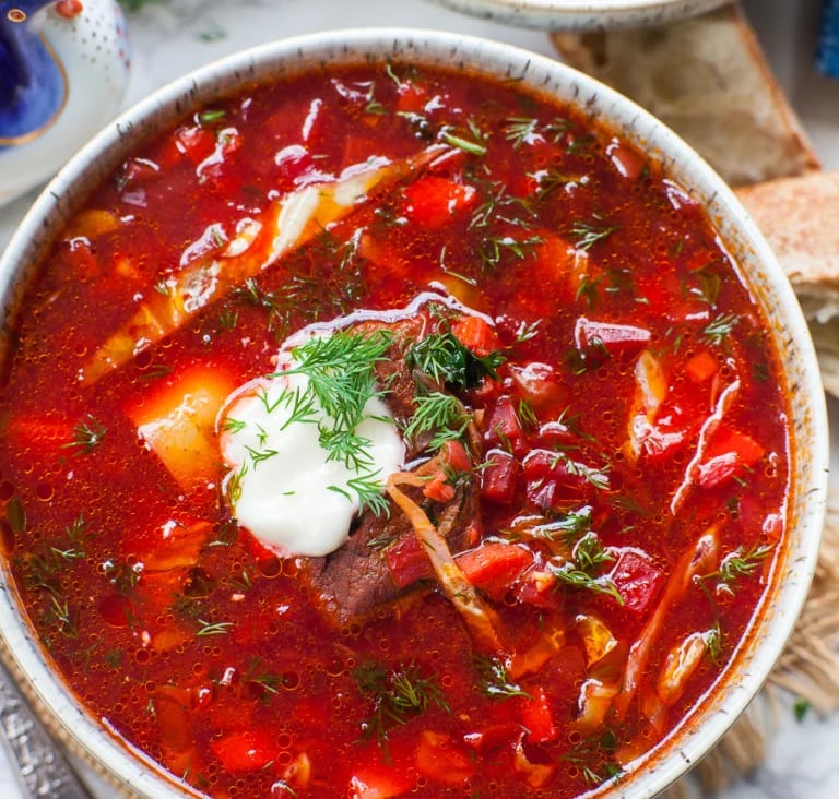Starters – Classic Borscht soup (beef, beetroot, cabbage, tomato, potato, fresh herbs)