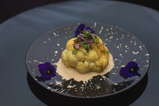 (fırınlanmış bütün karnabahar, fındıklı pesto ile doldurulmuş, baharatlı vegan yoğurt ve vegan peynir eşliğinde)